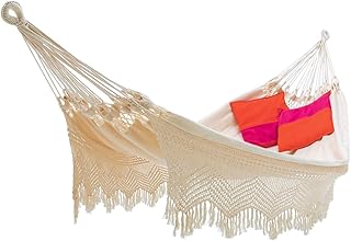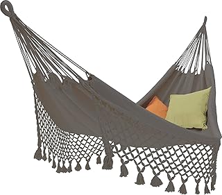 Amazon.com : ecomundy Romance XXL 380 - Classic Beige Double Hammock with Fringe - Handwoven - Organic Cotton GOTS - 2 Persons - 160x260x380cm - 250kg : Patio, Lawn & Garden Elegant solid green classical hammock with ecru fringe of premium quality. Traditionally woven, using the best quality organic cotton with an exceptional high fabric density of 344 g/m². Because of the royal bed surface of 160x260 cm and a load capacity of 250kg it is suitable for use by 2 persons. ECOMUNDY hammocks stand out because of their comfort, luxurious look and durability. And on top
