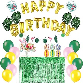 Anniversaire Tropical Jungle Party Deco Happy Birthday Ballon Or Kit Summer Party Decoration Ananas Papier Decoratif + Feuille Artificielle Tropicale + Nappe Frange Vert + Photobooth Tropical